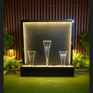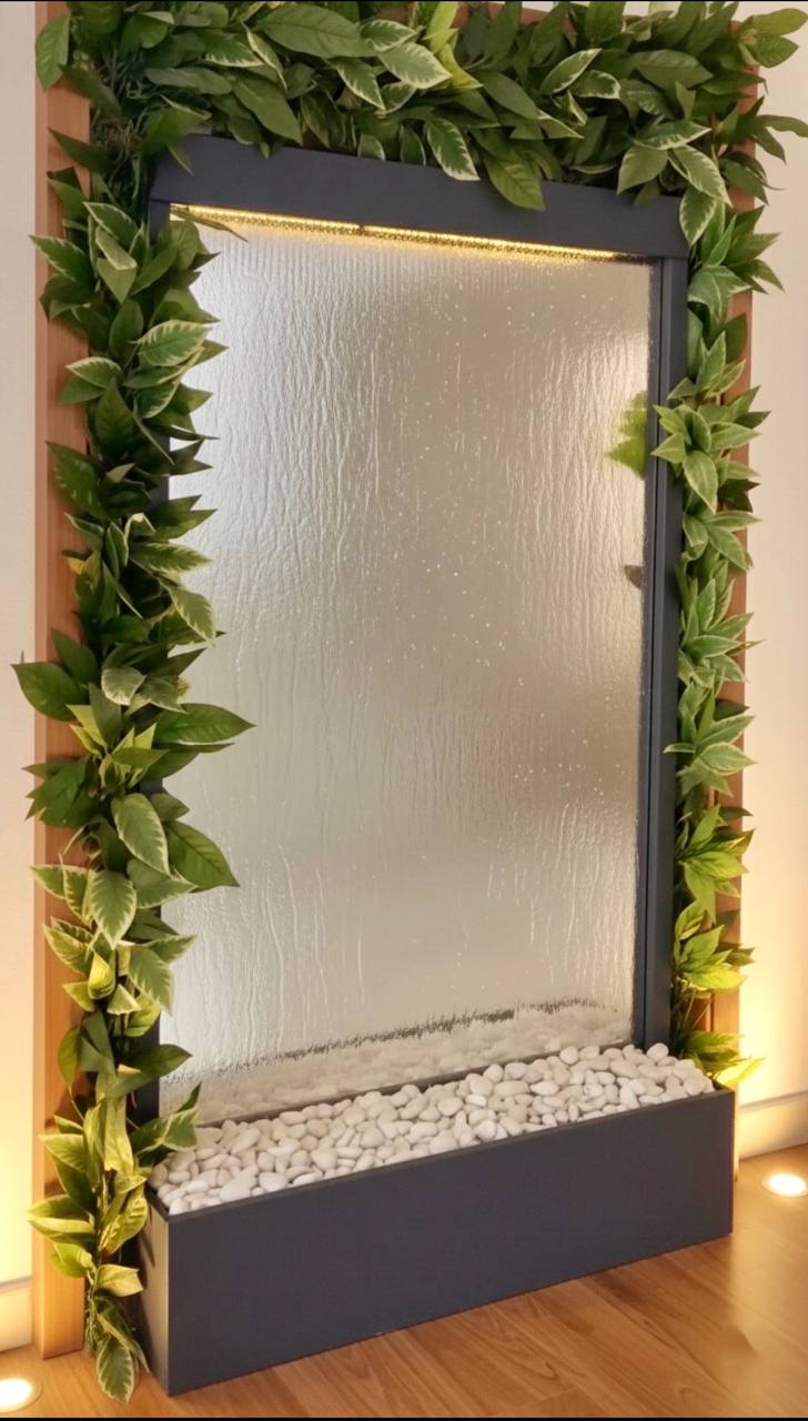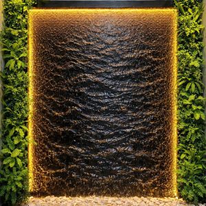 الماء ينساب من الأعلى ليرسم “غشاءً” رقيقاً فوق الزجاج، مما يمنح حركة مستمرة وهادئة في المكان.