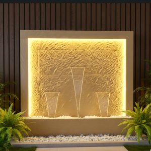 يوجد شريط اضاءة يسلط الضوء مباشرة على تماوج المياه أثناء نزولها، مما يخلق تأثيراً براقاً يشبه الكريستال.