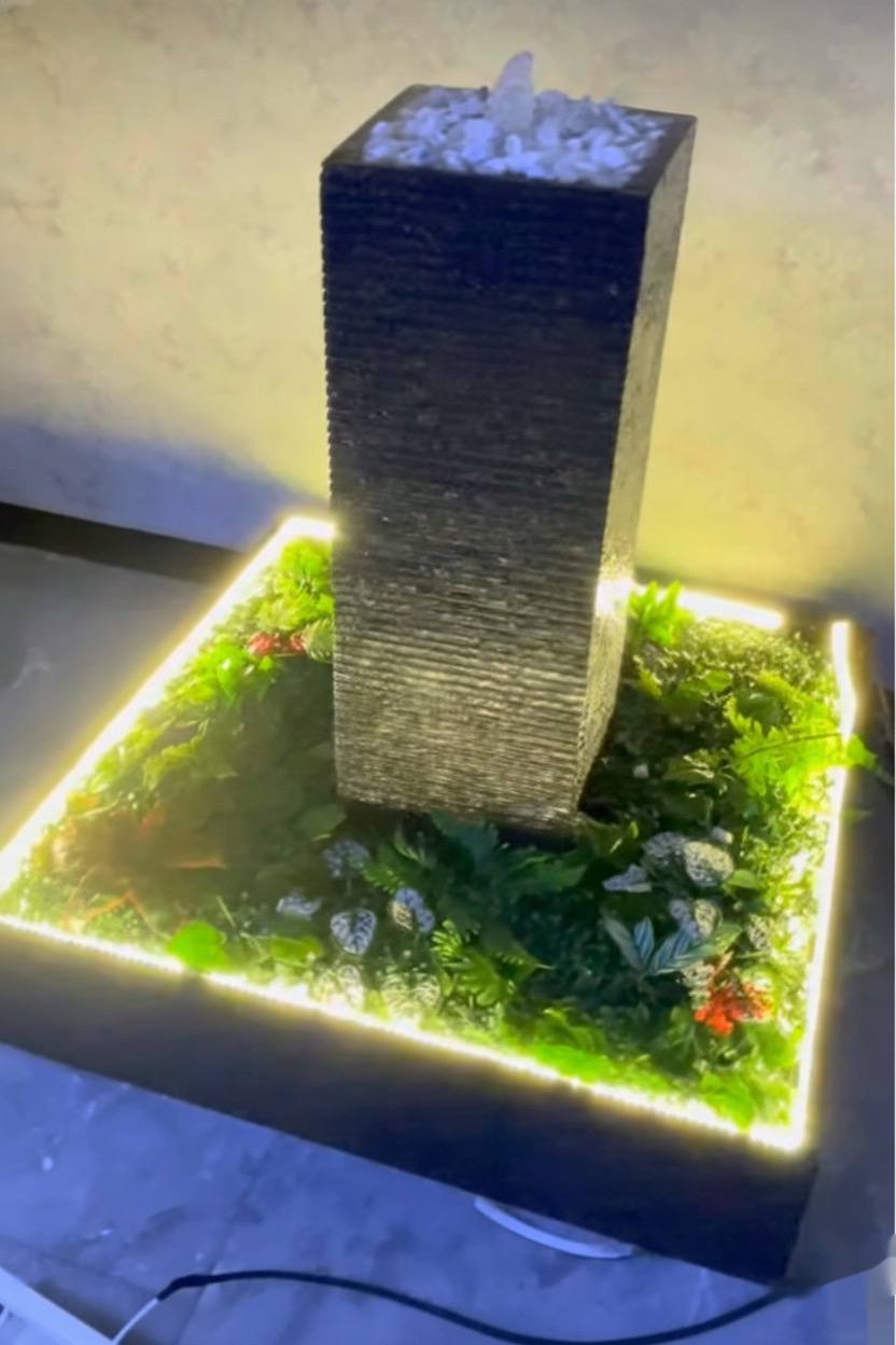 تتميز هذه النافورة بإضاءة LED محيطية مدمجة عند حواف الحوض، مما يعزز حضورها في الأماكن المظلمة ويعطي انطباعاً بأن النافورة “تطفو” فوق الضوء.
