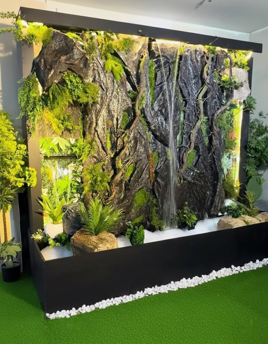 يأتي الحوض بتصميم أسود مطفي أو مغطى بالحصى الأسود والأبيض لتوفير تباين لوني جميل مع الخضرة الصارخة مما يجعله شلال غابة استوائية جميلة مناسبة للمجالس أو المداخل.