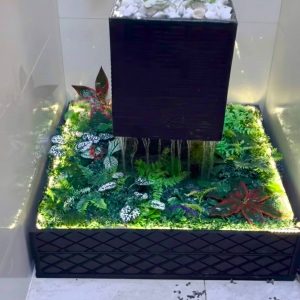 الديكور النباتي: يتم ملء الفراغات بين الأعمدة داخل الحوض بأعشاب ونباتات خضراء متنوعة لتوفير تباين لوني مع لون الأعمدة الداكن.
